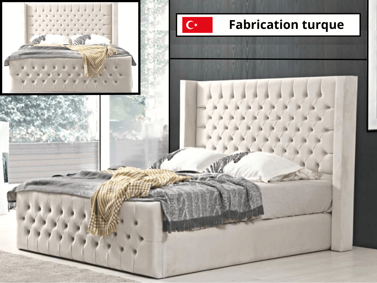 Structure & Matière : Cadre et Tête de lit en panneau agglomérer, capitonnage Mousse HR, Tissu Velours.