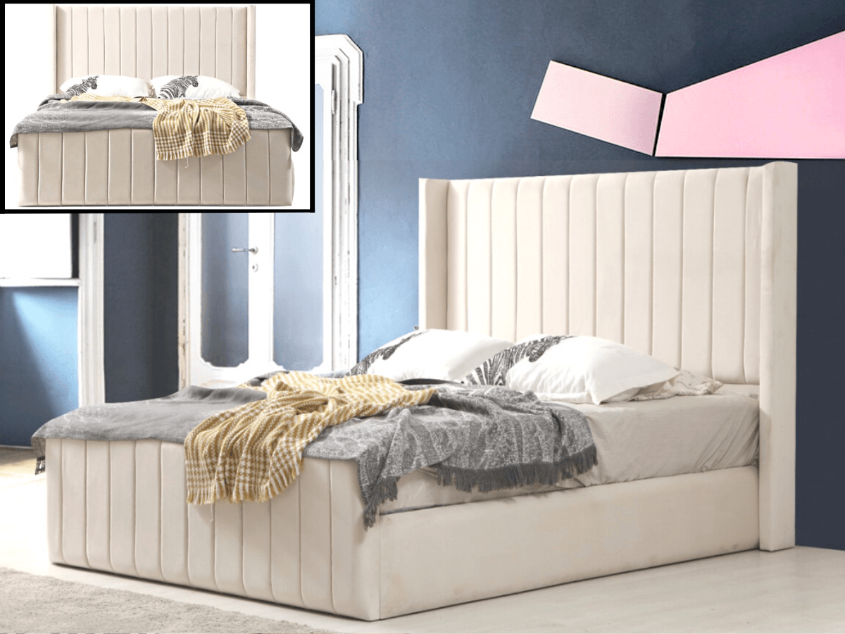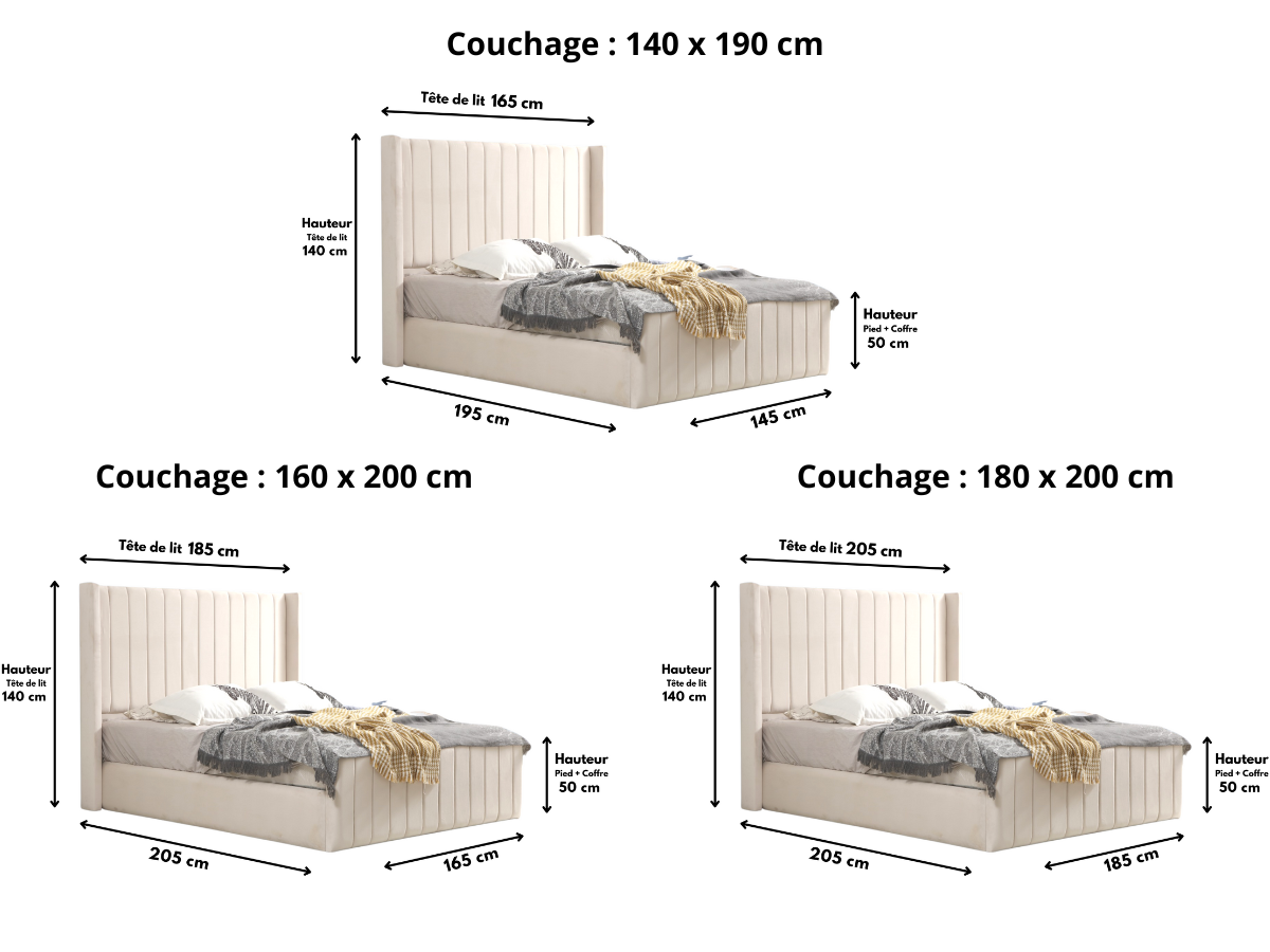 Structure & Matière : Cadre et Tête de lit en panneau agglomérer, capitonnage Mousse HR, Tissu Velours.