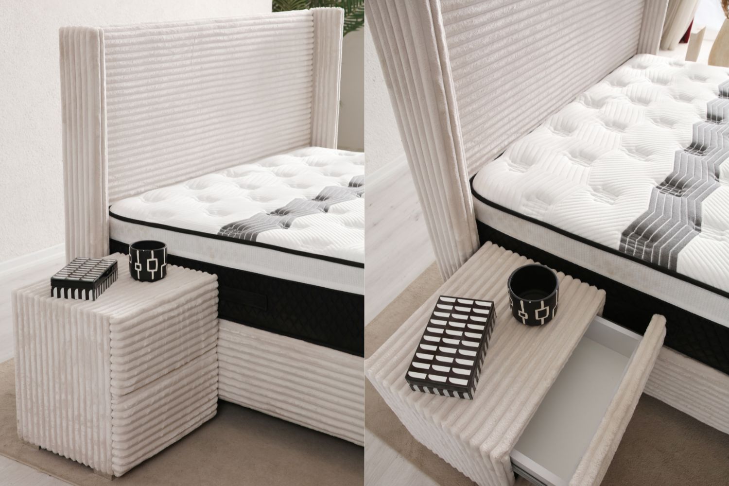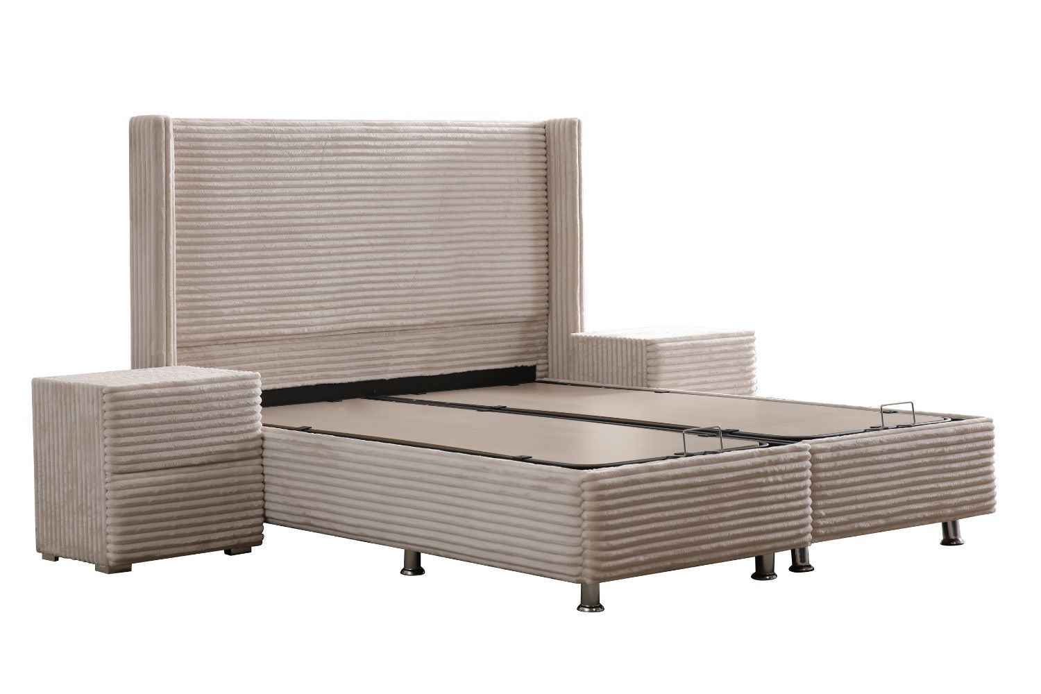 Structure & Matière : Caisson de Coffre en métal, contour en panneau aggloméré, Mousse HR, Tissus velours côtelé